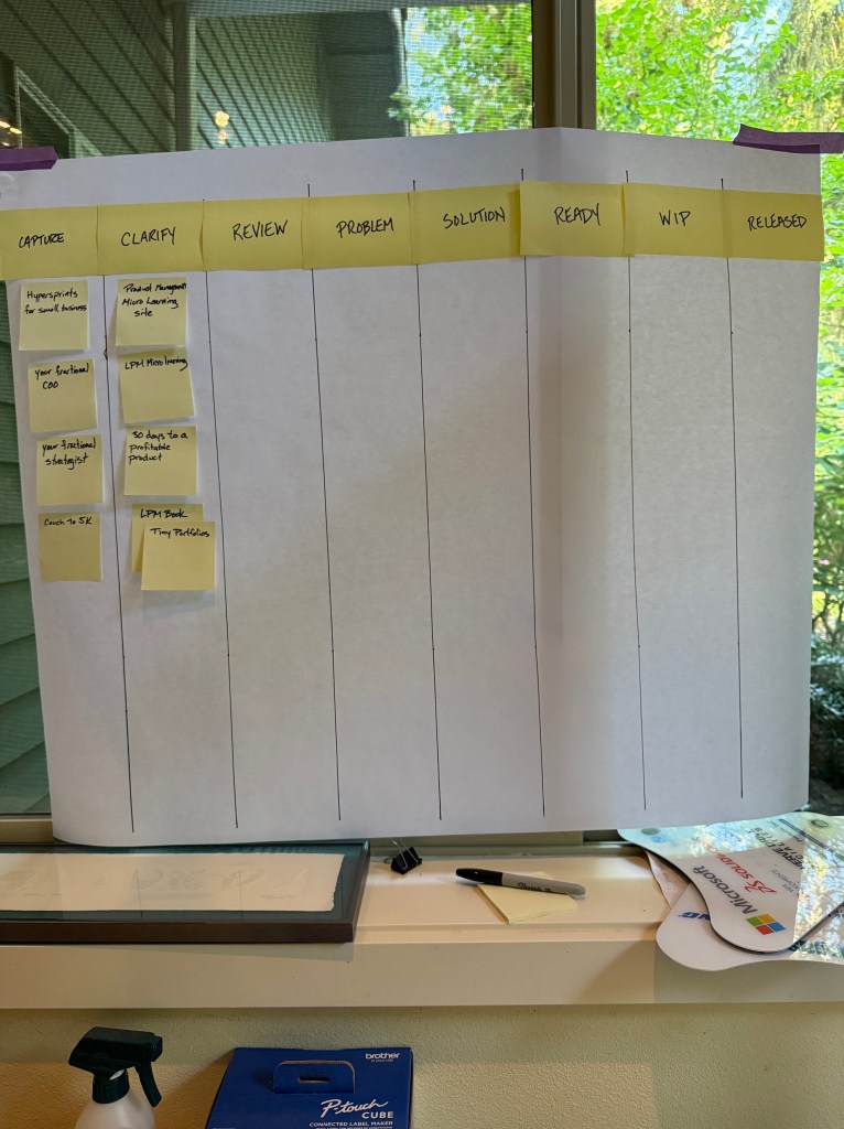 The Idea Map allows me to play with the concepts and see what combination and recombination can do for me. However, there’s still more needed. I intend to develop these ideas into full products. There’s a tremendous lot of work that needs to be done to accomplish that. Some of these ideas will surely make the cut, but many will not. So I need a process to help guide my thinking as I evaluate the ideas and try to bring them to maturity. So I have a Product Innovation Kanban board.