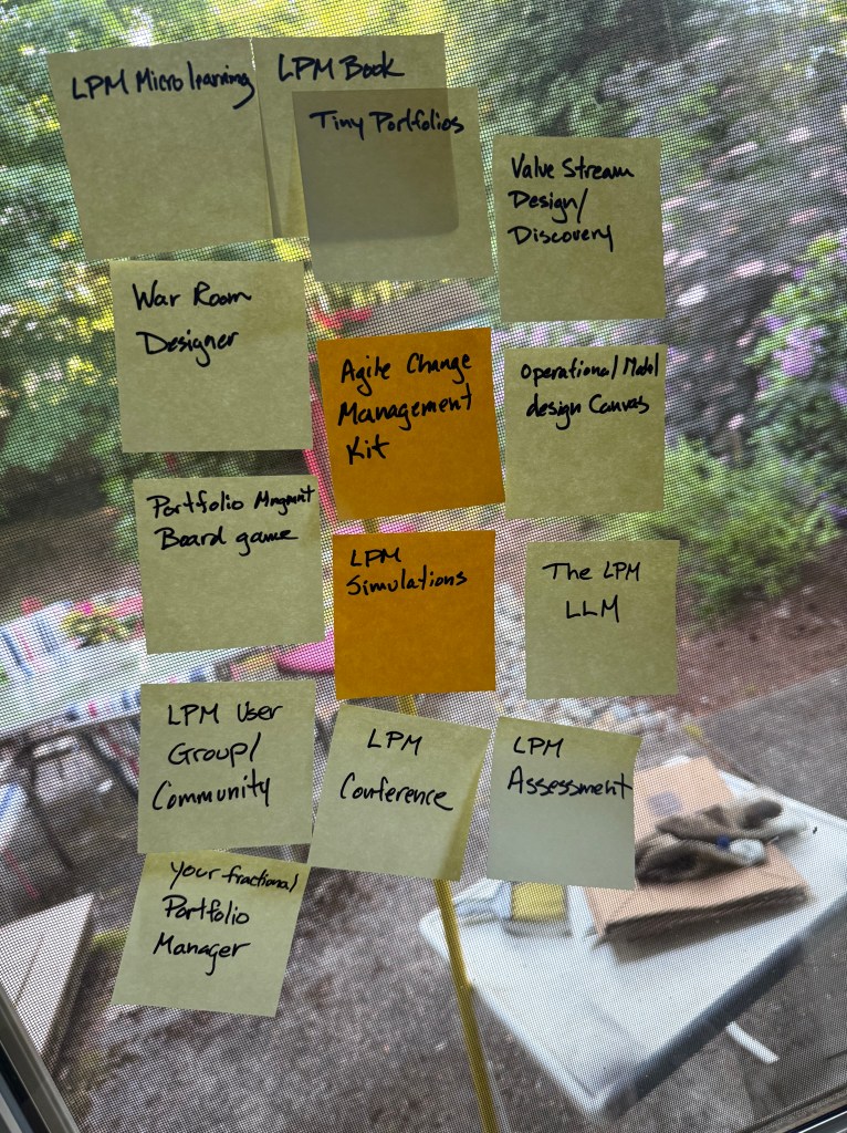Today, I decided to take one of my product ideas and dig into it more deeply. My first step was to review my idea board and look for a common theme. I knew I wanted to write a book about portfolio management, so I scanned the board for any products and tools related to that topic. From there, I was able to form a small cluster of related offerings.