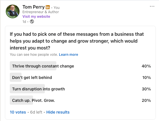LinkedIn has become a great testing ground for running lightweight polls. I take the same problem statements and push them out to a broader audience. It gives me a larger sample size and often reveals which words or phrases resonate with people I don’t already know.